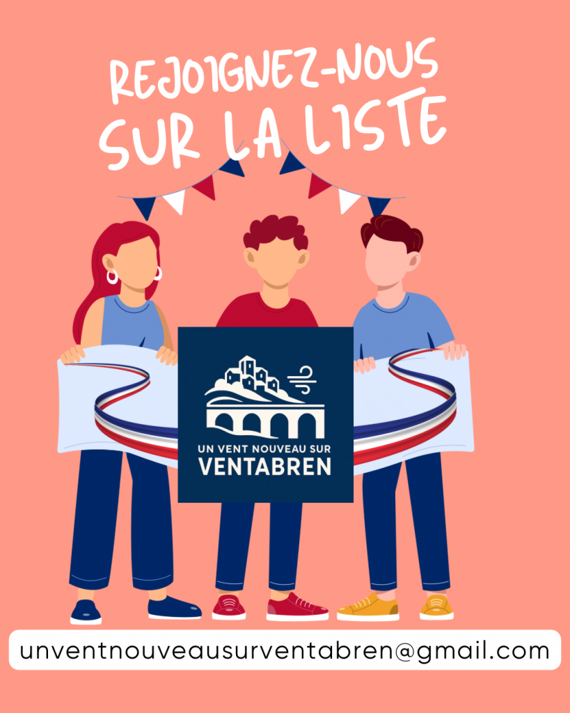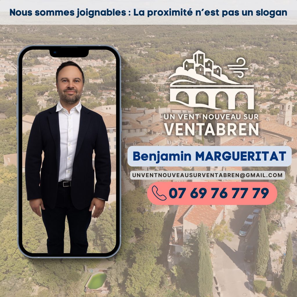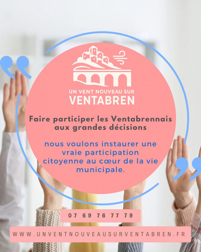 C’est pourquoi nous avons décidé de créer une liste citoyenne, « Un Vent Nouveau sur Ventabren », composée d’habitantes et d’habitants engagés, de tous horizons et de tous âges, rassemblés autour d’une idée simple : mettre l’humain et le bon sens au cœur des décisions municipales.